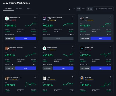 ● Become a copy machine: Users can view and filter top traders known as copy readers on the Copy Trading Marketplace. Once a leader is selected, the user can allocate a certain amount of capital, and the system automatically reflects the transaction.